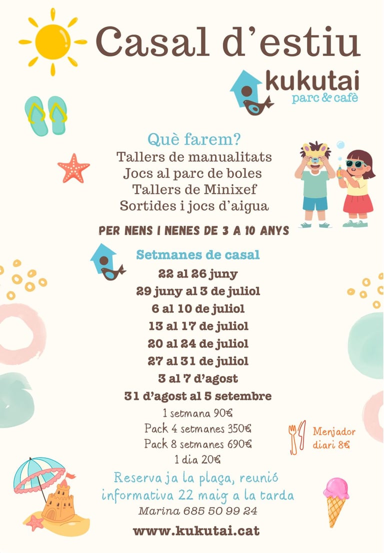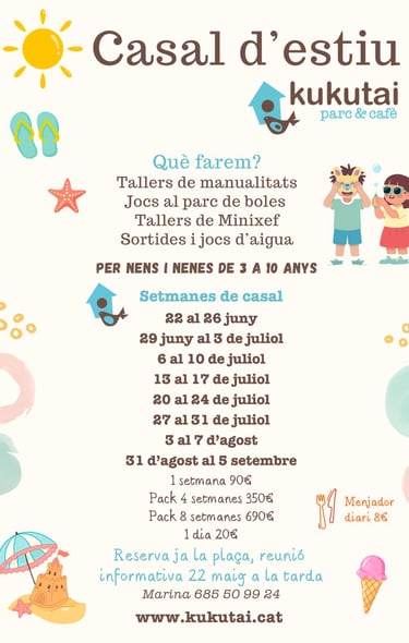 El Casal d’Estiu de Kukutai Arenys és una proposta ideal perquè els nens i nenes de 3 a 10 anys gaudeixin de les vacances en un entorn divertit, segur i ple d’activitats. Situat al nostre local amb parc de boles i zona de jocs, a la Plaça de l'església d'Arenys de Mar ofereix un espai pensat per al joc, el moviment i la socialització.
